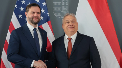 2026 年 4 月 7 日,好意思国副总统贾斯汀·D·范斯(左)和匈牙利总理维克托·奥尔班在匈牙利布达佩斯会面时抓手。